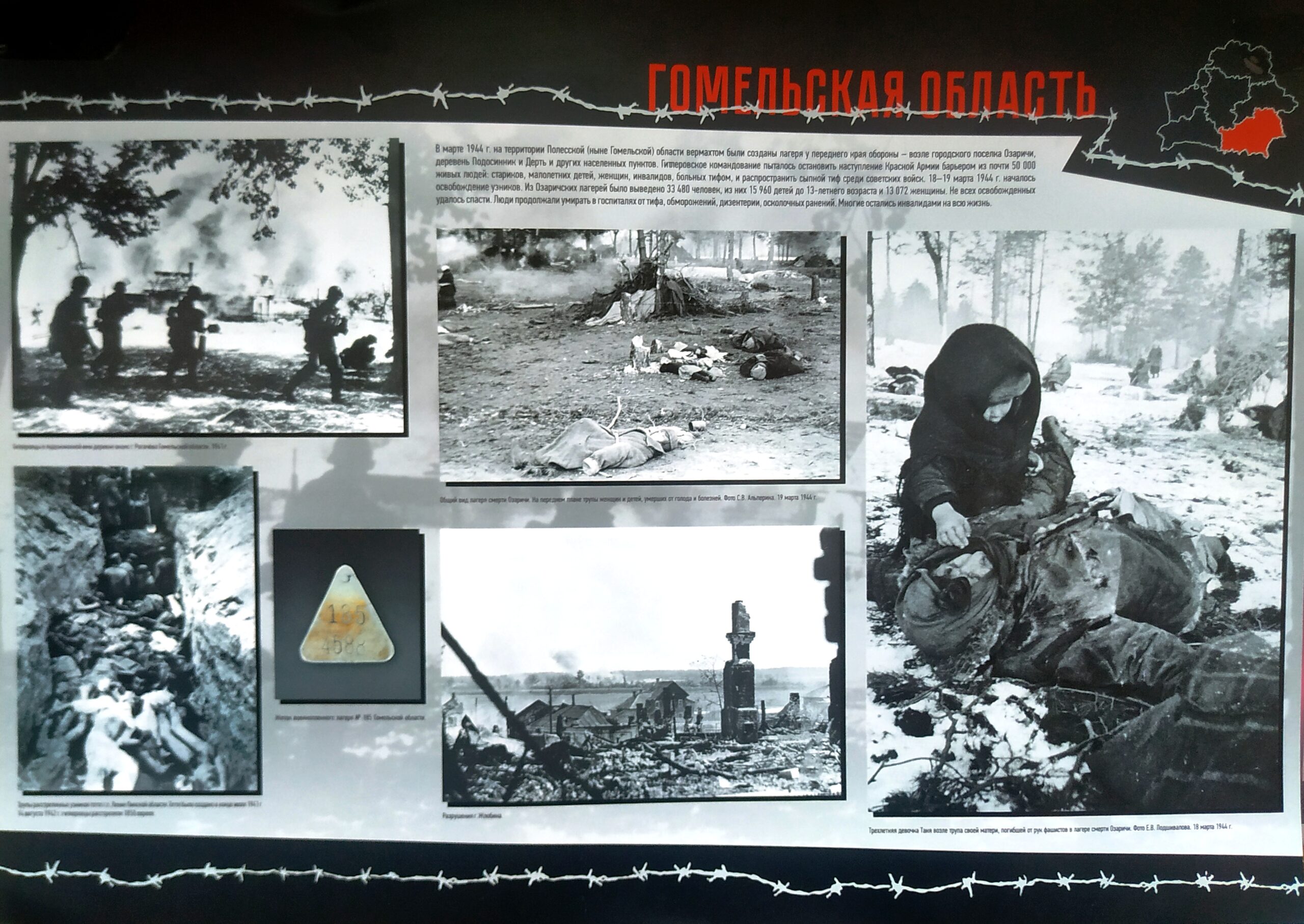 Самой чудовищной страницей хроники геноцида на территории района стал лагерь смерти в Озаричах. Он был создан в марте 1944‑го и просуществовал всего неделю. За это время здесь было уничтожено около 20 тысяч человек. Без еды и воды узники содержались под открытым небом на территории, обнесенной колючей проволокой. При попытке развести костер, чтобы хоть немного согреться, охранники открывали огонь.
